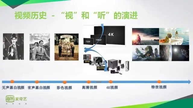 从18世纪,视觉残留理论发现之后,电影诞生,从无声的电影,黑白的电影,到后面高清的,3D的,4D,5D的影院;刚开始黑白的电影电视是不清楚的,我们希望清楚,后来发现光有图象没有声音,和日常的沟通相悖的,又加了声音。后来声音感觉不够动听,开始出现了立体声,杜比公司作出了巨大的贡献,开始有环绕立体声,家庭影院。传输技术的改变,从你只能到电影院里看电影,变成了可以用无线电波看电视,后来通过有线电视可以看到高清电影,互联网的出现,把电影和电视搬到了互联网上,才有了在线视频。大家再看在线视频和TV的主要区别,是可以互动,TV上只能选台,互联网上可以快进,评论,点赞。爱奇艺是最近一二年开始做云计算,2013年启动爱奇艺的智能化的项目,发展了两年的时间,今年最火的方向是虚实结合,这是一个大概的整个视频行业的发展的简史。