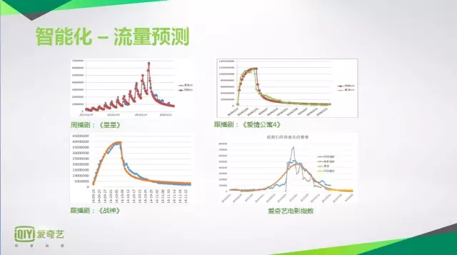 回到票房流量预测,这是很多互联网公司在做的事情,谷歌也做过。视频行业是特别烧钱的行业,早上醒来,拿打火机烧100块钱,没有我们烧钱的速度快,今天是加一个鼓风机都没有我们烧的速度快。对我们来说最大的成本是版权,买一部剧,一部电影的时候,根本不知道有多大的票房,收视率,播放量,也无法知道ROI是多大,我们以前花了4000万买了一部电影,放下来收益只有800万。很多时候拿到剧本就要决定买还是不买,这个行业的竞争是非常残酷的。我们做了一件什么事情,在这个行业为了节省我们的资金,为了给广大的用户更多的内容来看,我们要猜测哪些是我们网络视频用户感兴趣的东西,我们做了这个模型。左上角是《来自星星的你》,这部剧掀起了韩剧疯涨的热潮,那之前韩剧大概一部剧集最多1万美金,之后涨到20多万美金,原因是这部剧非常火,去年初红遍大江南北。左下角是《战神》提前半年预测的,准确率达到95%,右下角是爱奇艺的电影指数,电影是更难预测的东西,会受到各方面的影响,电影靠广告是不可能收回成本的,更多的要靠收费,决定了到底有多少用户会对他感兴趣。我们做了电影指数,红色是预估的结果,最近在做一个有意思的事情,《天降雄师》,正在放映的电影,我们的内容部门在打赌,说不可能票房过7亿,计算机算是7.5到8亿之间,我现在问了一下现在票房是7.4亿,这个角度来说利用智能,让电脑不只是搜集信息,分析信息,而是一定要帮助我们预测未来,这种预测是靠人脑做不到的。