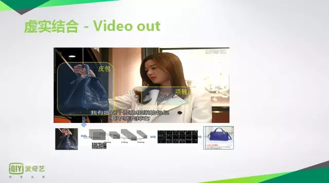 虚实结合的产品,Video out,以前看到一个明星的衣服不知道是什么牌子,要到百度进行搜索,而现在我们自动识别场景,知道用了什么包,戴的项链,我们和电商结合,以后可以一边看,一边买东西。现在识别的精确度到了85%以上,对TOP5的商品类别,经过深度的识别,进行精准的标签匹配。