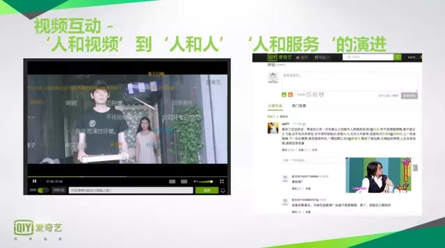 看一下现在我们做了什么。这是视和听的演进,在线视频出现的时候都是SD的,320*240的,当时爱奇艺上线的时候,第一次把高清视频搬到了网上,推1080P,去年1月份全网推出4K。去年春节之后,曾经在业界有一个很小的轰动,因为当时在爱奇艺网页上出了小的视频,只有3分钟《叶落知秋》是第一次一个影片从拍摄到后期、上传、在线的编解码、到播放是完全的4K,如果有4K显示器可以看一下,品质感非常强,以后4K电影流行之后,明星会非常的难办,因为所有的化妆,毛孔会看得一清二楚。原来观众只是在网上听立体声、双通道,去年爱奇艺和杜比合作推出环绕立体声,我们把电影的发展阶段,快速的推向中国的互联网,今天在互联网上,几乎可以享受到视频所有的画质和音效。最早在电影院看电影,后来有了无线电,在家里看电视,小时候谁家有18寸的彩色电视机,大家都会去他家看电视,现在各家有线电视都快被拆掉了,好处是可以随时随地看,可以挑选不同的清晰度,可以互动,我们看一下未来,互动是在视频上了互联网之后才有的,最早人们可以在视频上发现拖拽行为,可以点赞,进行评论,最早是人和视频之间简单的互动。后来是人和人之间的慢慢的开始有了互动,因为大家都在评论同一个视频,一个人可以回复另外一个人的点赞和评论,现在的趋势是说人和服务通过互联网做进一步的连接,我们也看到了在互联网整个的平台上会在看电影的时候,或者看视频的时候,会卖电影票,推荐不同的游戏,推荐不同的商品。从互动的角度再把现实生活中的商业搬到线上,推动服务进行连接。