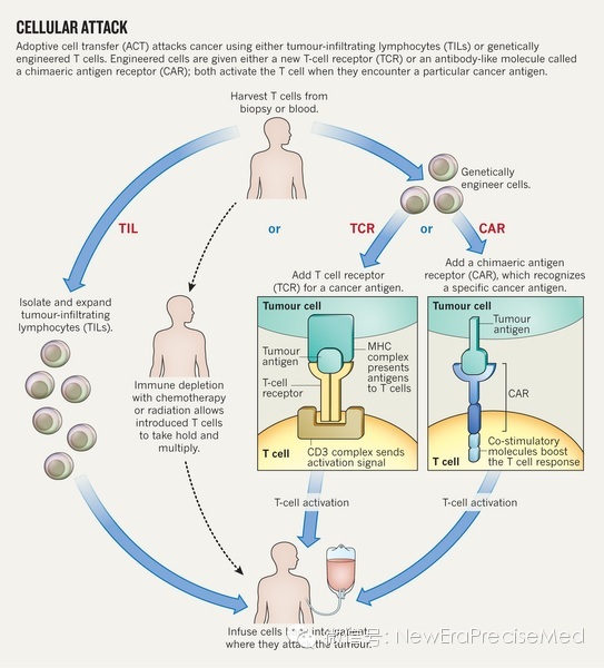 在实验室培养至足够数目,随同促进抗原特异性增值的T细胞生长因子白细胞介素-2(IL-2),重新注回到患者体内。然而,内源性免疫系统具有维持免疫应答的抑制机制,这些机制可以防止新注入细胞有效地工作,所以患者必须用药物或辐射耗尽内源性免疫细胞,让新注入的T细胞保留和充满身体。这种方法称为肿瘤浸润淋巴细胞(TIL),
