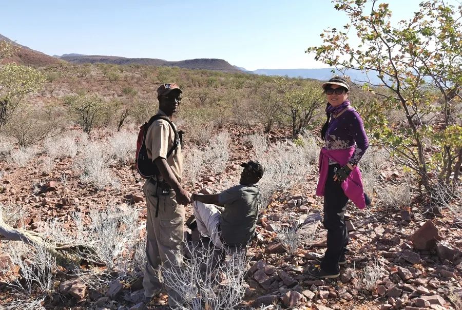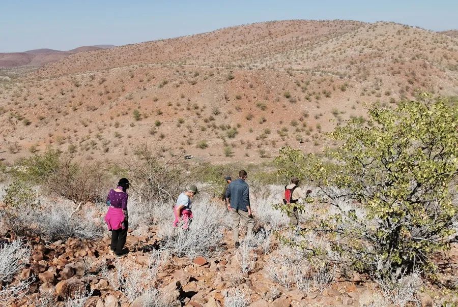 我们坐在山坡上,就这样注视着对面山上的黑犀母子,虽然距离甚远,但是我还是很享受这一刻。黑犀母子警惕地用完餐,慢悠悠地消失在山林间,眼看快到中午了,我们从山上下来,沿着干涸的河床徒步了一段,才坐车回到下榻的格鲁特贝格酒店(Grootberg