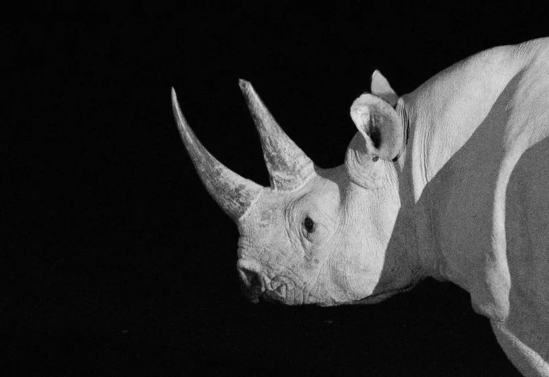 “黑犀”这个名字被用来区别于白犀,体表颜色更接近于灰白色,体型大约是白犀的三分之二。最显著的差别在于黑犀上唇呈钩状,可以帮助其吃到灌木丛和树上的叶子,因此也被称为“钩唇犀”,通常长有两个角。黑犀主要分布在南非、纳米比亚、津巴布韦、坦桑尼亚和肯尼亚。二十世纪,受欧美狩猎爱好者,以及当地人的活动影响,黑犀种群数量急速下降。1960年至1995年间,种群数量减少了98%,不到2500头,处于濒临灭绝的边缘。后来得益于动物环保组织坚持不懈的努力,黑犀种群数量从二十年前的历史最低增至一倍,目前约有5000头,仍然属于极危。