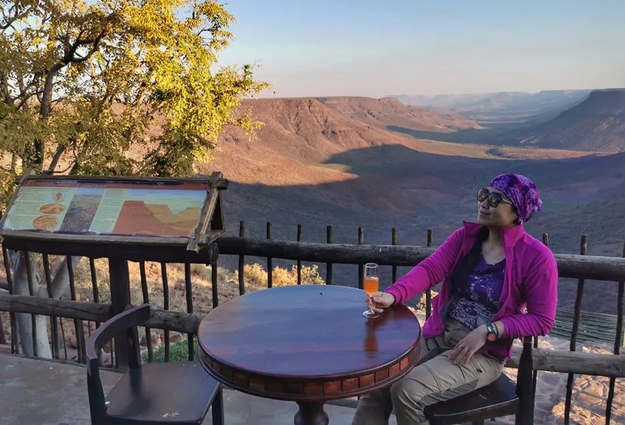 Plateau高原的边缘,十几栋茅草顶石头小屋俯瞰壮观幽深的峡谷,还有巨大的花岗岩风化后的平顶山,这亿万年形成的地质奇观在日落时分尤其绚丽。我要了一杯鸡尾酒,坐在阳台上看着阳光一点点消失在山后。