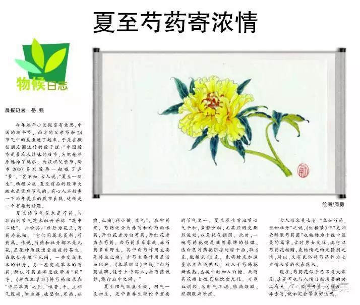 夏至的节气花木是芍药,与谷雨的节气花木牡丹并称“花中二绝”,并喻其:“牡丹为花王,芍药为花相。”它们同属毛莨科,芍药属。传说,芍药和牡丹都不是凡花,是花神为救遭受瘟疫的苍生,盗取仙丹撒下凡间,一些变成木本的牡丹,另一些变成草本的芍药,所以芍药名字里就带着“药”字,《神农本草经》将芍药收录在“中品草药”之列,“味苦,平。主邪气腹痛,除血痹,破坚积、寒热、疝瘕,止痛,利小便,益气”。在中药里,芍药还分为赤芍和白芍两味药,开白花者为白芍药,开红花者为赤芍药。白芍药多系家栽,入药需剥皮蒸晒,赤芍药多系野生全根晾干即可。其中白芍作用主要是补血止痛;赤芍主要作用是活血化瘀。《本草纲目》中载:“白芍药益脾,能于土中泻木;赤芍药散邪,能行血中之滞。”