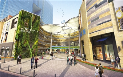 此项目为上海第一家真正意义上的花园式购物中心,其不仅在商场4楼、5楼的公共空间建起了屋顶花园,更突破传统意义上的绿化空间,着力于第五立面的运用,即将垂直立面的特点充分发挥,整个商场仿若一个巨型生态链,地面和触摸墙体中铺设专门的绿化养殖管道系统,在有限的空间中呈现花园美景及进行养分供给。