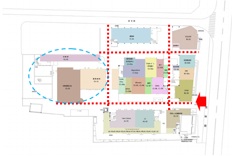 项目只有东侧沿武林路,北侧孝丰路是一条狭窄的人行道路,西侧临老居民楼,南侧临安吉路小学。主出入口只能设在武林路上,而孝丰路设置开放式小型休闲广场。整个建筑格局分为三段,类似三明治把两条内部道路夹在中间。我们只好牺牲了部分建筑面积,将中间的楼梯一楼部分开出两个通道,内部形成一个“井”字形的动线,实现项目内部动线的环流。但是这个动线设置存在缺陷,如果西侧的商铺合并成一个大型商铺,作为主力店的一部分,而不散租给创意小店,整个项目的动线就相对更完整一些并且解决了死角区域的问题,这是当时没有想到的。