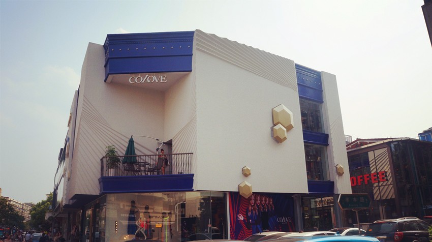 外立面设计采用多种不规则造型,内部街区保留了原本的白玉兰树池,其他地面部分铺设了人造石地砖。为了能够给入驻商家充分的发挥空间,项目外立面以及内部公共区域没有做大范围的改建。