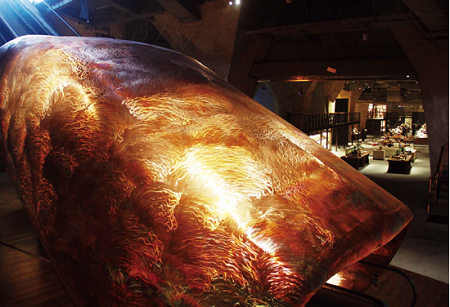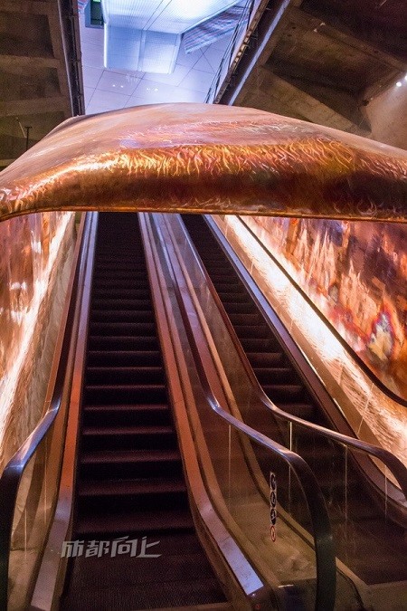 毛继鸿坚持在中部电梯出口打造一个以“时光穿梭机”为概念的雕塑。这是一个看上去金黄色,又变幻出五光十色的红铜焊接雕塑,重达十六吨,包裹着电梯与方所相连接的出口区域。铜身经过从内而外的捶打磨光,再经由药水擦磨与灼烧,散发出低调而神秘的光泽。当顾客在电梯下降的过程中,越是接近方所,越能感受到雕塑表面如凤凰羽毛般变幻的色彩,又如《星际穿越》中时光隧道的诡谲光晕。