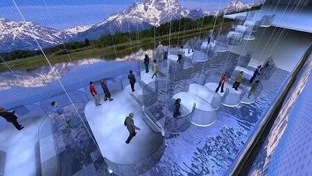 空中连桥中具有一些趣味性设计,包括机械艺术装置、水景流沙艺术墙,并且,屋顶也被充分利用,加上了艺术气质绿植,做成了空中花园,不仅具有功能性,还具有观赏性。为城市中心增添了绿色空间。