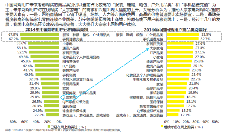根据艾瑞网最新发布的《2015年中国网络用户调研报告》的内容来看,网购最集中的区域还是集中在服装、鞋帽、箱包、户外用品、手机话费充值、家居百货、大宗家电、IT产品等这几个日常消费品类中。