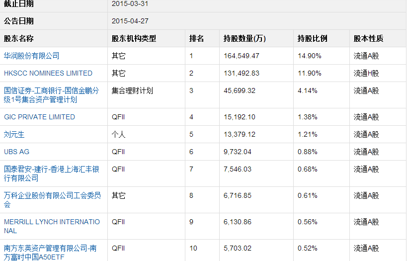 以王石为精神领袖的万科治理结构和优秀职业经理人文化,一直是业内的翘楚。我们查阅2015年3月公司最新披露的前十大股东情况如下: