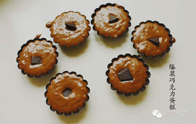 6、蛋糕模具里先倒入一半的原料,接着每个模具中间放入一块巧克力,然后再把模子灌满,(不怕胖的就再放一块巧克力),放进预热好的烤箱,设置到180度,烤10—12分钟,冷却后再脱模。做好后的蛋糕可以放入冰箱保存,两三天没问题,吃之前再用微波炉加热半分钟,就可以了。