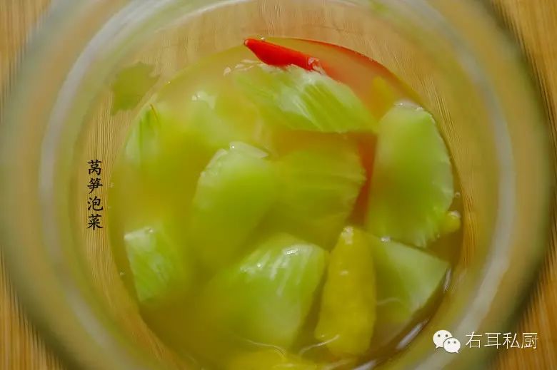 莴笋根茎部分晾干水分后削成滚刀,放进泡菜坛,隔天即可捞起食用。注意莴笋全程不可沾上油,以免泡菜坛生花。洗澡泡菜的详细做法,可参看前面的文章《泡菜开花生出魔咒》。