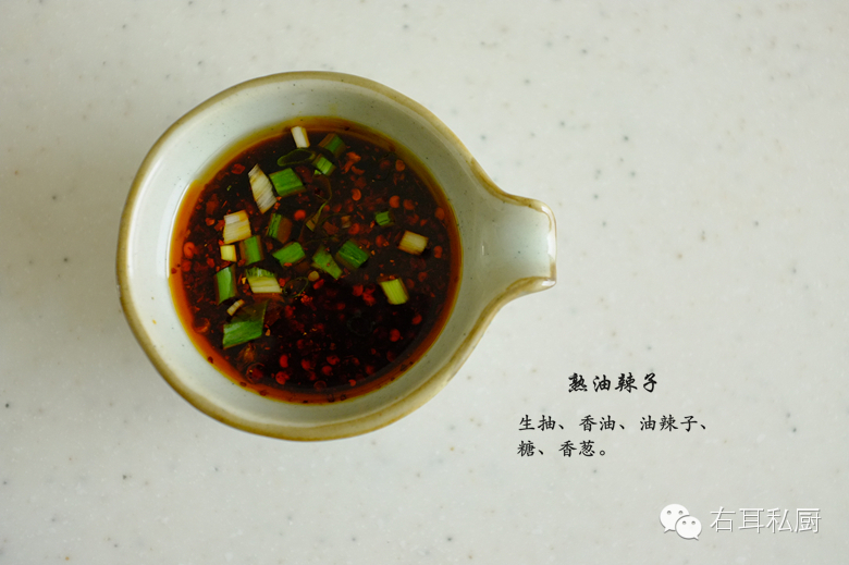 熟油辣椒:红油辣子、生抽、白糖、香油、葱花。