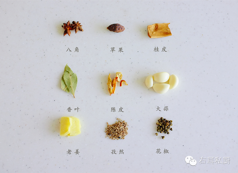 香料:八角、草果、桂皮、孜然、花椒、大蒜、姜片、香叶、陈皮。