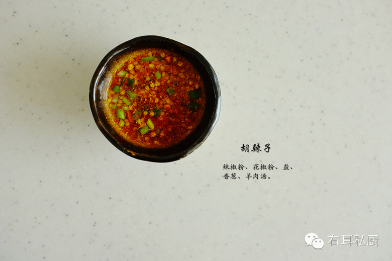 胡辣子:辣椒粉、花椒粉、盐、葱花加一勺羊肉汤调匀。