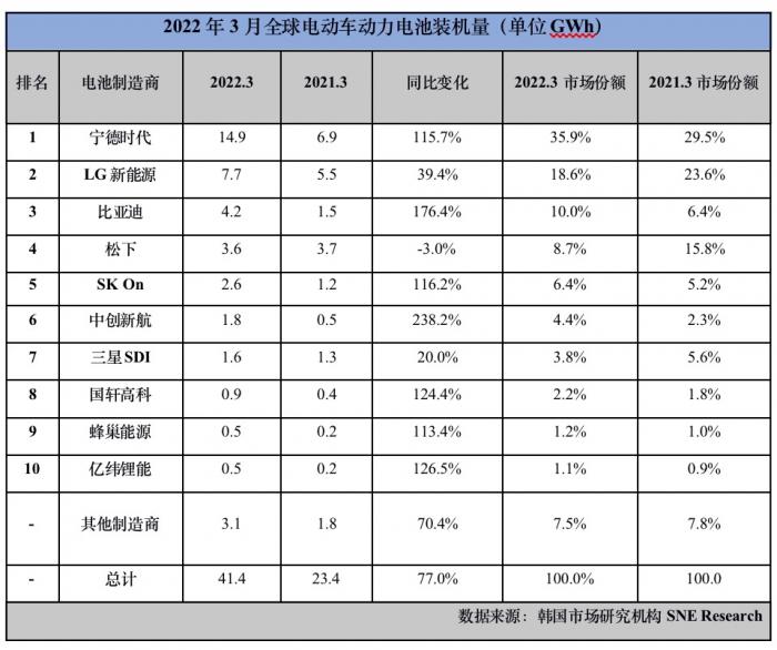 具体来看,2022年3月,宁德时代装机量达14.9GWh,同比增长115.7%,并以35.9%的市场份额夺得第一;韩国LG新能源以7.7GWh装机量和18.6%的市场份额紧随其后;比亚迪超越日本松下,装机量达4.2GWh,同比增长176.4%,成为又一家闯入前三甲的中国电池制造商。