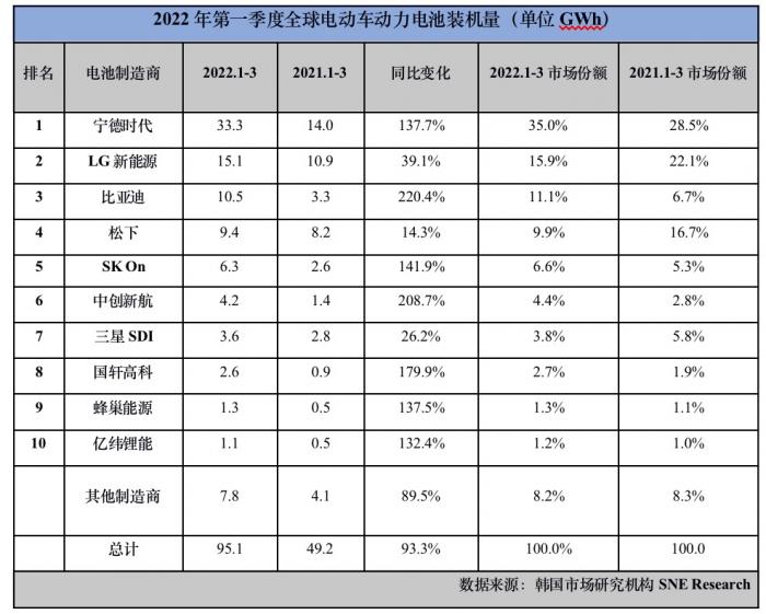 一季度全球动力电池装机量:宁德时代市占率达35%比亚迪闯入前三