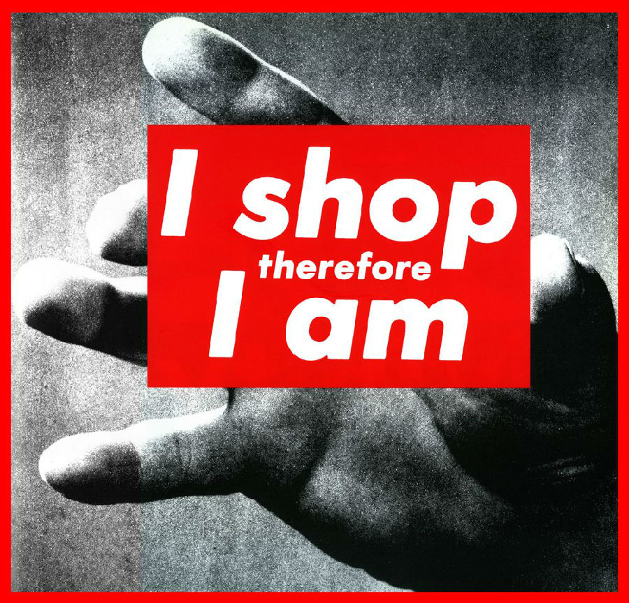 ◎《I shop therefore I am》(我买故我在),这幅作品中的文字I shop therefore I am是对哲学家笛卡尔I think therefore I am(我思故我在)的颠覆。