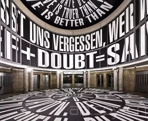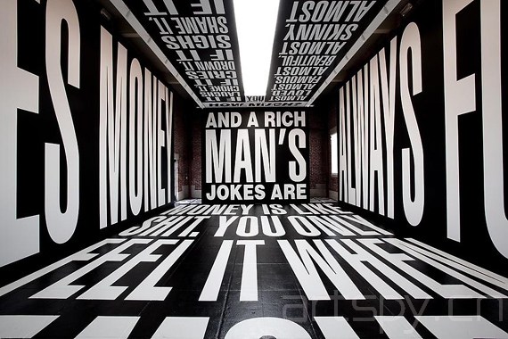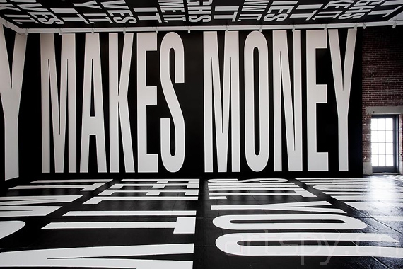 ◎在装置展Circus中,她用黑白的词语和句子填满了装置空间的整面墙、地板以及天花板,这为观众们带来强烈的视觉感受。其中的文字是对金钱以及权力的评述,例如,地板上的文字是“金钱就像屎一样……”