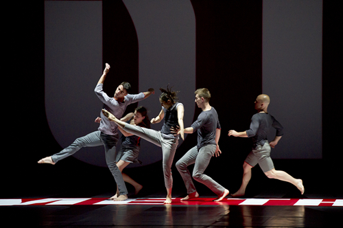 芭芭拉•克鲁格将自己的创作看做是“一种替换性的工作”,就是用她想出的某句话来替换图像中的像。在《倒影》中,米派德充分给予了克鲁格以设计自由,不再有奢华的珠宝配饰,不再穿着华丽的舞服,5位舞者以相对生活化的状态登场,在五个段落中,他们彼此时而紧密,时而疏远;动作质感时而柔和,时而躁动。随着灯光的聚焦与明暗,黑与白中烘托出大红这样的缤纷底色,与舞者们灰黑色调的简单舞服形成了鲜明的反差,产生出充满感性的效果。