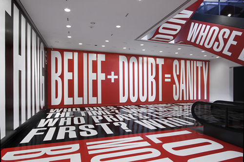 通过对字母进行扩大和夸张的处理,来使其变得具有图案的特征,同时也使语言和意义能够通过一种空间的方式感知到。她曾将那些覆盖了文字的墙面称为“思维的漫步空间”。她的作品一直以来都没有发生太大的变化,始终维持了对语言、图式设计以及现成图像的运用。