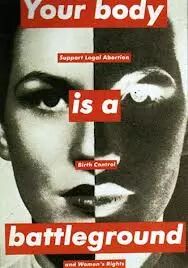 ◎《Your body is a battleground》(你的身体就像是战场)画面上的一个写实的女性头像与观众的目光对碰,她的眼神显得坚毅不绝。这是作者为了支持计划生育与维护女性权力而作的。