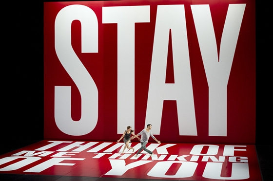 ◎拉开帷幕,整个舞台是红色、白色、大写粗体英文字“留下,想我在想你”STAY