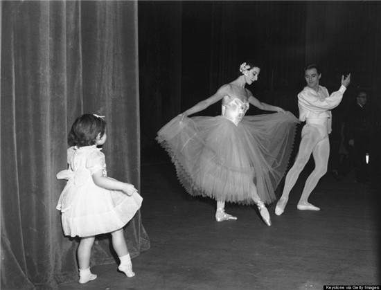 1949年,Alicia Markova Asshe在舞台上与Anton Dolin排练,Asshe的侄女Susan在窗帘后面模仿她阿姨的动作。