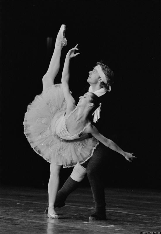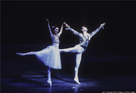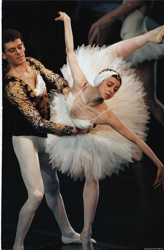 1990年5月2日,波士顿芭蕾演员Fernando Bujones(左)与俄罗斯芭蕾演员Nina Ananiashvili(右)出演柴可夫斯基的芭蕾舞剧《天鹅湖》。