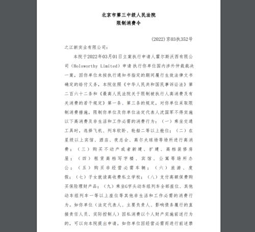 2022年5月20日,中国执行信息公开网显示,因未按执行通知书指定的期间履行生效法律文书确定的给付义务,之江新实业有限公司(下称“之江新实业”)及单位法定代表人沈国军被限制高消费。截至发稿时,限高令仍未解除。