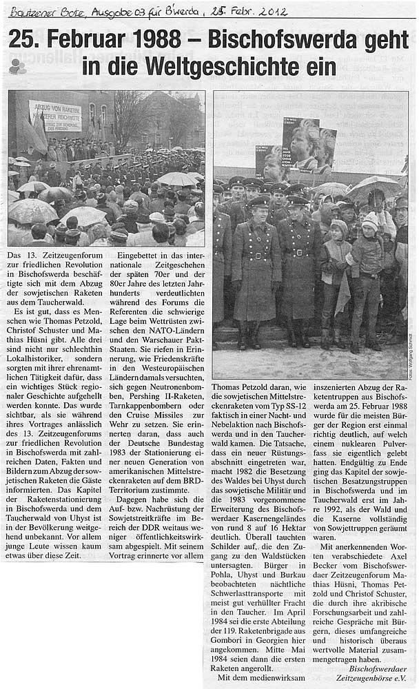 2012年2月25日,报纸上报道Bautzener核导弹在森林Taucherwald部署的历史: