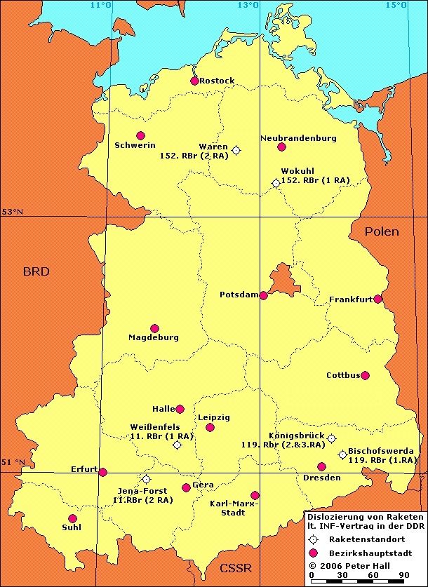 在70年代中期,东欧国家和北约都达到核均势。1976年,苏联在欧洲中程SS-10弹道导弹打破了既定的平衡。1979年,北约决定欧洲“潘兴-2”中程导弹的部署和巡航导弹“战斧”陆地移回。北约华约在东德导弹基地,建于四个地点:Bischofswerda的,克尼格斯布吕克,瓦伦和Wokuhl。(见地图)