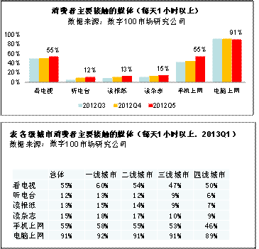 从媒介接触的角度,目前消费者(网民)接触最多的媒介是电脑上网,看电视的比例与手机上网的比例相当,手机上网的比例持续的提高,可以预见手机上网是会持续增长的一种媒介形式。