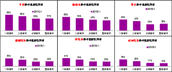 通过对比各个品类1季度在不同级别城市的表现,可以发现牛奶和瓶装水在各级城市的发展程度较为充分;对于果汁、碳酸饮料和运动饮料而言,三四线城市仍然具有较大的发展空间。 (图2)