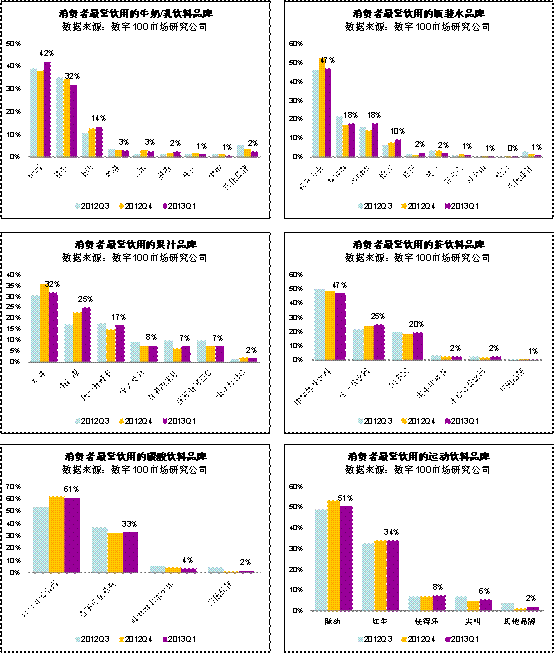 从品牌消费的层面看,在2013年1季度,以下品牌分获各领域的冠军: