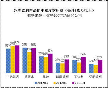 由于季节性的原因,各类饮品的饮用率都有较大幅度的提升(这里的饮用率指某品类每月饮用次数在6次以上的人群占比,是中重度的饮用率,相比普通的饮用率更具参考价值)。通过各个品类饮用率的对比可以发现,瓶装水、果汁饮料、碳酸饮料、茶饮料、运动饮料这类更偏向于多场合饮用的品类增加速度更快,而牛奶饮品虽然饮用率依然最高,但增长幅度不大,可以预见,随着天气的逐渐转热,饮品行业将逐步进入消费的高峰。(图1)
