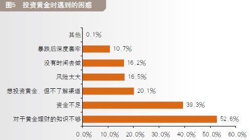 在投资黄金的过程中,52.6%的受访者认为目前对黄金理财的相关知识了解不够,39.3%的人则由于资金不足,无法满足其投资黄金的需求。此外,20.1%的受访者则表示虽然想投资黄金,但是对投资渠道不了解。同时,风险太大、没有时间去做以及暴跌后深度套牢也成为目前投资者较为困惑的主要原因。(如图5)