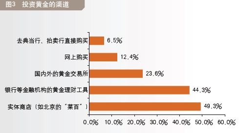 调查显示,在投资途径上,49.3%的受访者通过实体商店进行黄金投资,44.3% 的受访者则通过银行等金融机构的黄金理财工具进行,而从国内外的黄金交易所投资黄金的占23.6%,从网上购买的仅占12.4%。(如图3)