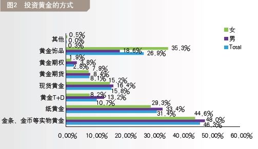 近年来,金条、金币等实物黄金颇受公众青睐。在本次调查中,46.3%的人表示愿意选择实物黄金进行投资,而希望购买纸黄金的受访者也达到了31.4%,同时黄金饰品也有26.9%的人喜欢购买。在已投资黄金的人群中,男性更愿意购买金条和纸黄金,而女性则更喜欢购买黄金首饰。(如图2)