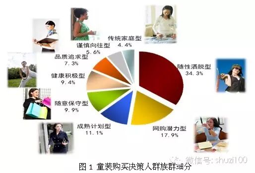 数字100通过对妈妈群体(孩子童装的购买决策者)生活形态和价值观的研究,将童装消费者划分为八大族群,分别是随性洒脱型,网购潜力型,成熟计划型,随意保守型,健康积极型,品质追求型,谨慎向往型,传统家庭型(图1)。通过分析我们发现,族群之间的差异性非常之大,这种差异对童装消费行为的影响,要远远大于孩子年龄、家庭经济状况对童装消费行为的影响。