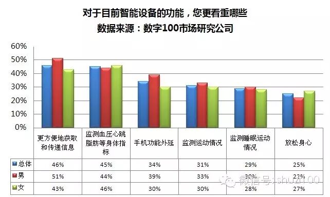 3:女性希望可穿戴设备对身体健康能给与帮助,男性希望它能体现更高的科技含量。消费者要求“方便获取和传递信息”是不可或缺的功能。