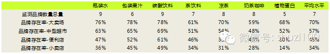 品牌“存在率”是审视铺货率的一个前提性的指标,对于品牌“存在率”低的渠道,若能实现较高的铺货率,则更能反映品牌的终端实力和受欢迎程度。