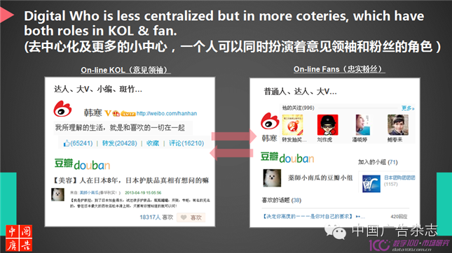 在互联网上既使是一个普通的消费者,也可以同时扮演着既是粉丝又是领袖的两重角色了。民间有更多的创意,草根有更好的创意,广告公司可以做的是创意的提炼和组合,并不是说所有的创意都来自于中介。