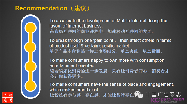最后有一些建议的话,想对今天来的企业代表和广告公司做一些提议,第一,在今天互联网的商业进程中需要加速移动互联网的发展,甚至直接步入移动互联网,移动互联网在城乡一体化差异当中作用已经是非常大了。第二,更多的靠单品实现。第三,今天的年轻人喜欢好玩的,海尔的产品创意没有消费者认为我在做一项工作,认为是一件很好玩的事,甚至帮企业带来一些内容的产出。最后让用户参与,粉丝参与,让他们实实在在参与进来,参与内容创造、参与内容传播,参与产品设计,这样粉丝才会让你品牌存在。