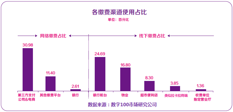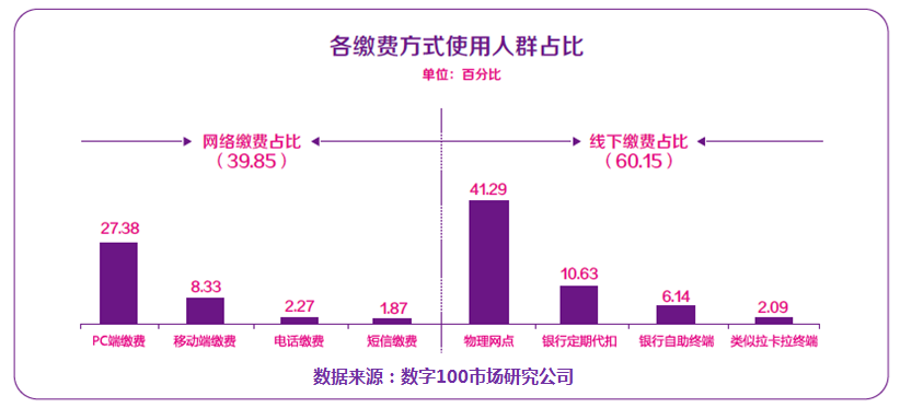 随着金融业务的发展和互联网对各个行业的推进,民众可通过银行网点、缴费官方网站、银行电子渠道、第三方互联网支付平台等多渠道对各个公共服务类别进行缴费。数字100调查数据显示:近4成的受访者经常通过网络方式进行各种费用的缴纳,另有6成的受访者仍以线下缴费方式为主。其中网络缴费方式仍以PC端为主,占比27.38%,而移动端则占比8.33%。在线下缴费方式中,受访者首要选择的是物理网点,占41.29%,其次是银行代扣方式,占比10.63%,而银行自助终端也占据一定位置,占比6.14%。另外迷你便民终端缴费的占比则较低,达到2.09%。http://mmbiz.qpic.cn/mmbiz/YRia7KW5Z0SjSPoqybHMibFLedfpVOaEnt1MhqheFRCw3LyiblWKWosTCRia5TFcJtIegzGXTiaUmR4oKhr3I8WWTIw/0?wx_fmt=png