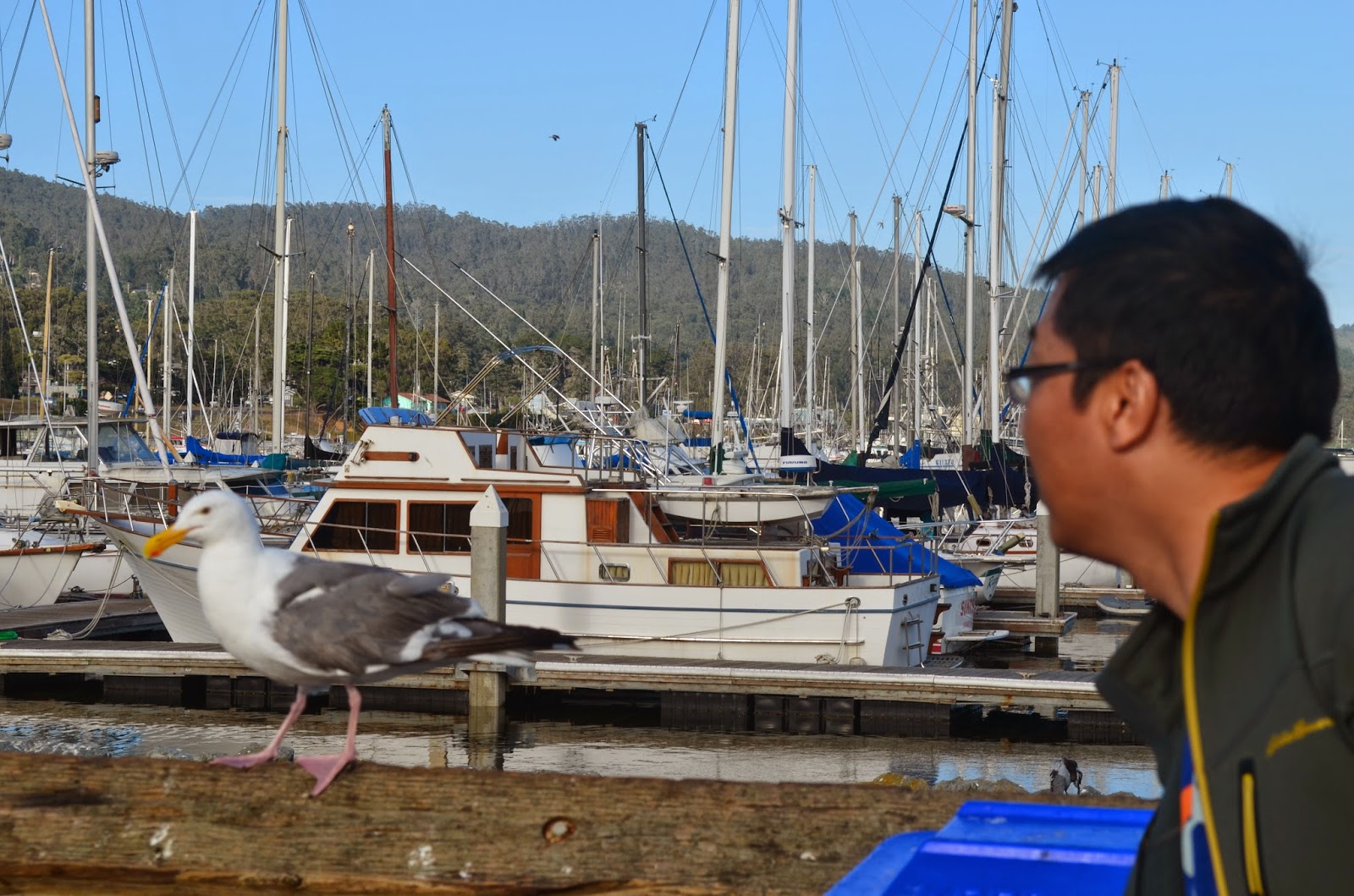 一条码头伸向水中,尽头处几许钓鱼之人和飞鸟各自戏耍,蓝马和棉衣们掏出各自相机手机平板哗哗狂照,远处有孤帆远影和朦胧岛物,近处有鸟人帆锚,似乎是个游艇俱乐部若干的船只停泊,真个是——