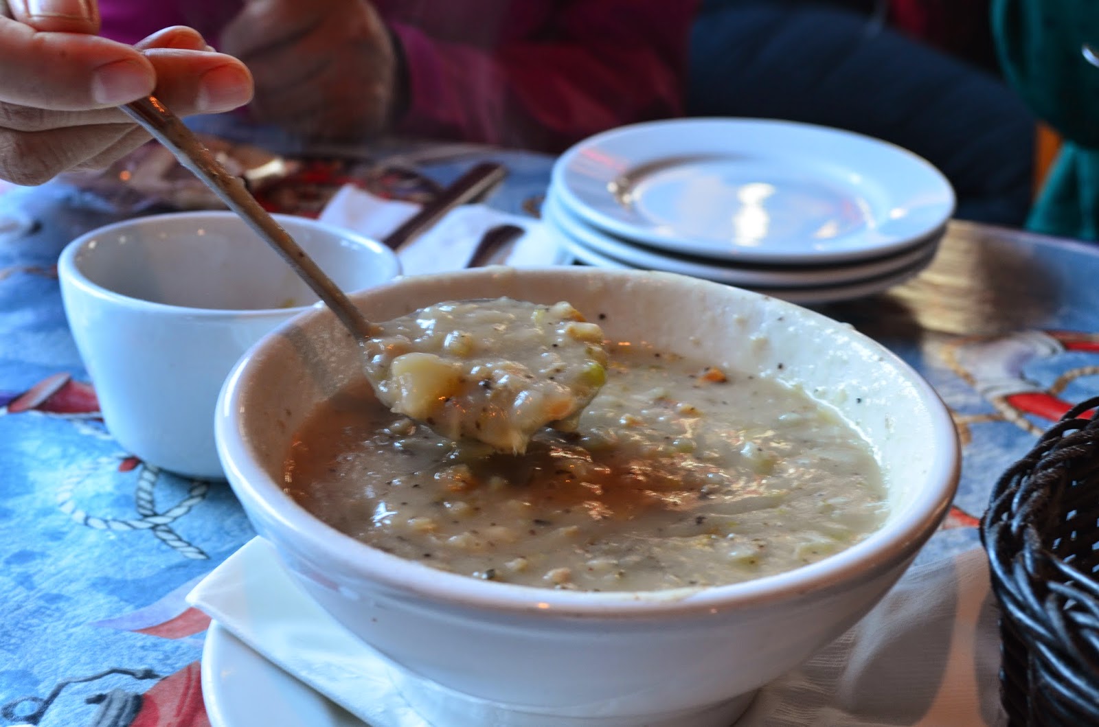 半个时辰已过赶回小馆,只见小馆里外小桌排得密密麻麻颇有蓝马故乡瓢城街道酒肆之风采。“卤家便来个啤酒吧,此馆离下榻之地不远,不会碍事的。”蓝马生性鲁莽常被大领讥笑没卤,卤在北京方言应该为货,料之意,故自嘲为卤家。此馆招牌菜乃蛤蜊汤(clam chowder),大凡海鲜店都少不了此汤, 还有就是炸鱼薯条(fishchips)。蛤蜊汤味道真不错,其他的众人尝了后到不觉失望。