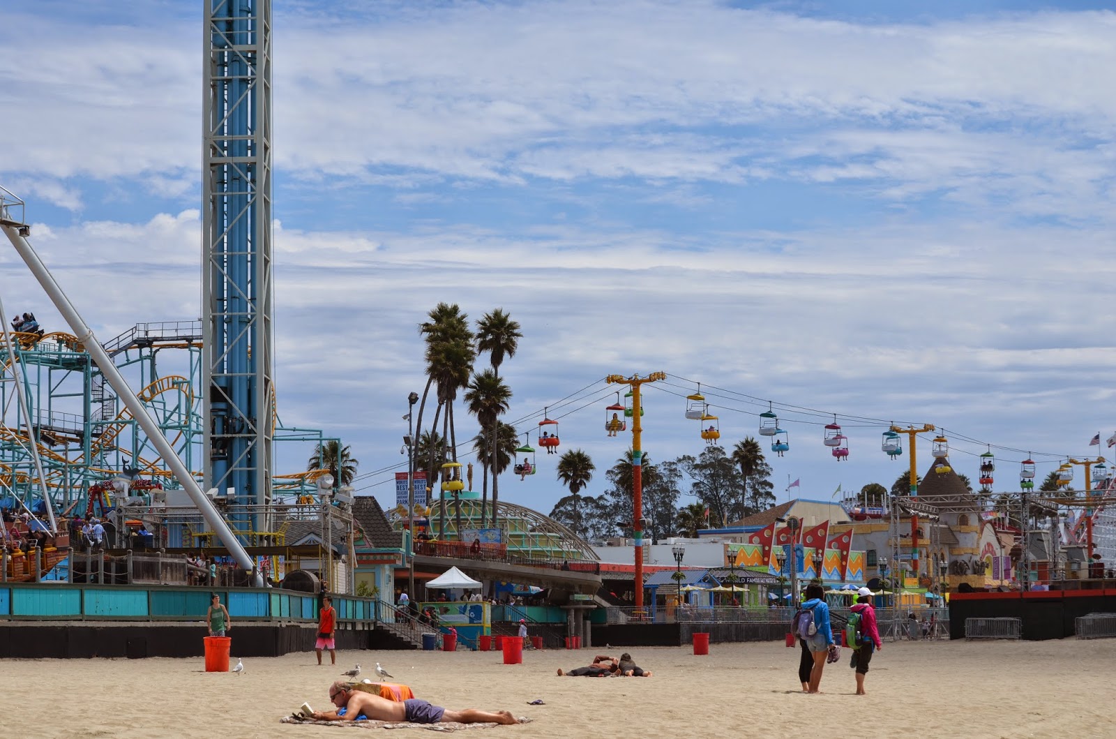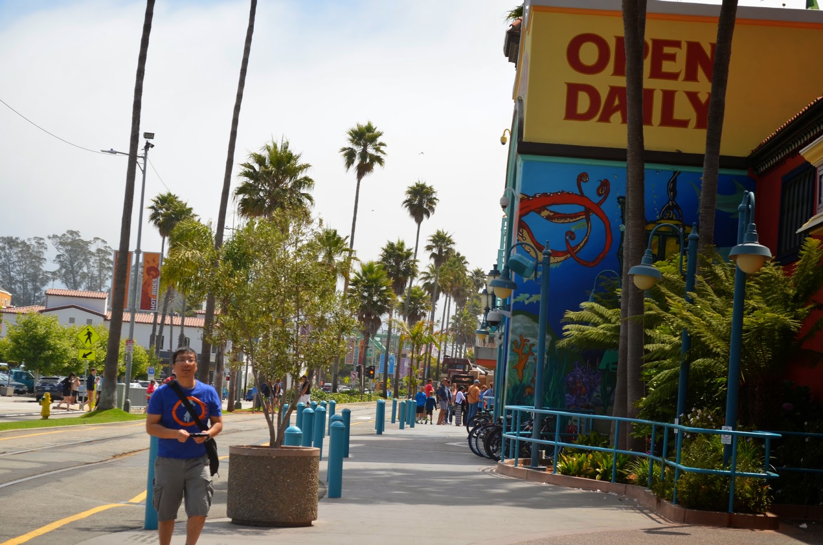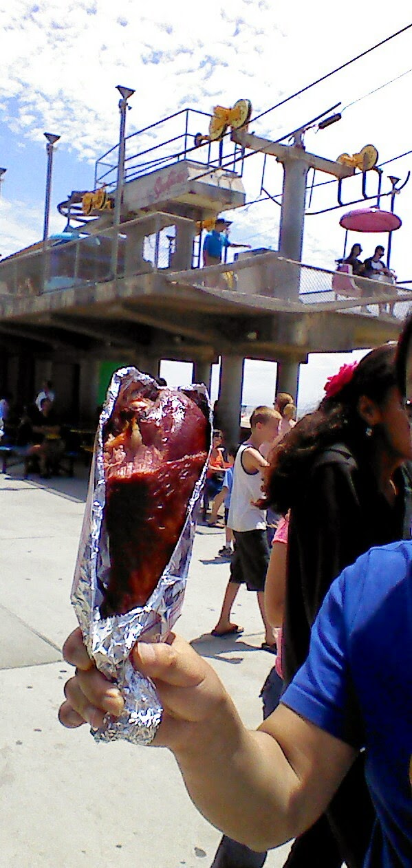圣塔克鲁兹海滨路,沿海有个游乐园据说最古老的过山车在此。一行四人在圣塔克鲁兹沙滩厮混一阵,棉衣们去逛逛游乐场;蓝马坐在阳光下看看show,一个乐团连蹦带跳地说是参加AGT(米国梦想秀)的组合,还让去签名。蓝马有点百无聊赖,好在棉衣们给买了蓝马最爱吃的每次去米国必吃的大火鸡腿,味道好极了。蓝马依稀记得10年前去迈阿密迪斯尼和宇宙电影城时4刀即可,如今9刀了。